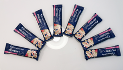 - Mπάρα πρωτεΐνης εμπλουτισμένη με καρνιτίνη και δυο μέταλλα, με επικάλυψη λευκής σοκολάτας, γεύση ράσμπερυ και γιαούρτι.
